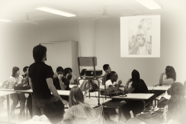 Le photographe Romain Philippon est passé ce matin présenter son travail et sa manière de voir la photo à la classe de 211, ainsi qu'aux élèves reporters de 205, 204 et 203 venus plus nombreux que prévus.
